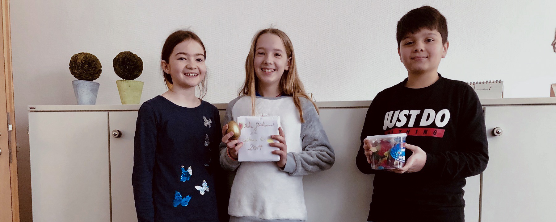 Sophia aus der 6a ist mit offenen Augen durch die Schule gegangen und fand das Ei in der Kunstausstellung. Mit ihr freuen sich Lea, Roni und der Rest der 6a. In diesem Jahr war das goldene Ei in einem der…