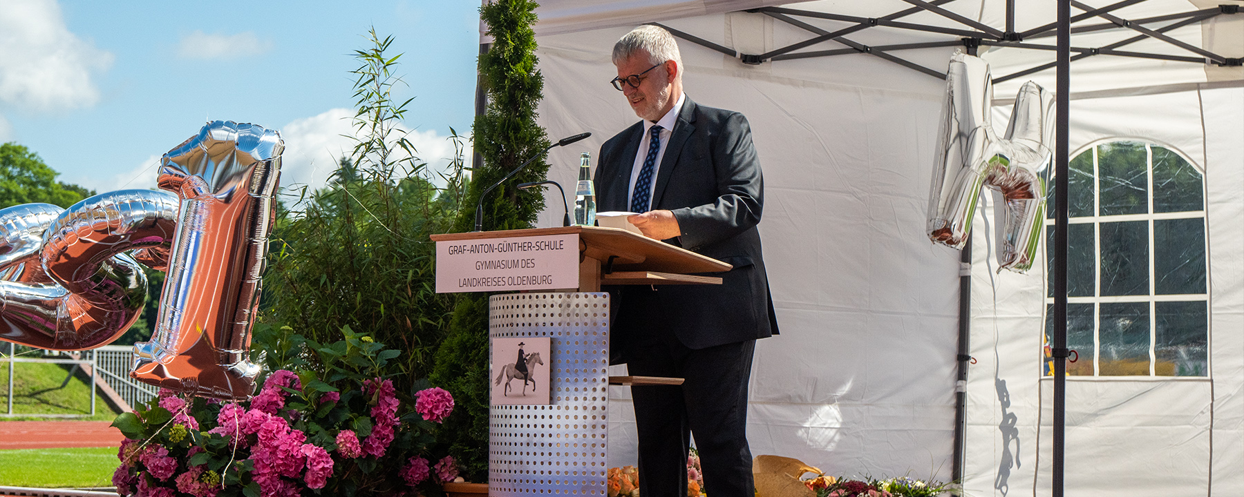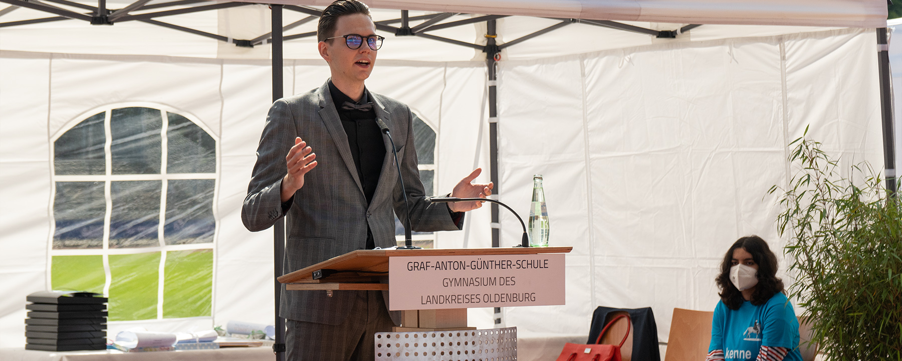 135 Abiturientinnen und Abiturienten hat die Graf-Anton-Günther Schule in diesem Jahr, darunter elf mit einem Notendurchschnitt von 1,0 bis 1,4. Und alle freuten sich wirklich, dieses Zeugnis überreicht zu bekommen, denn Corona hat doch seine Spuren hinterlassen. Die meisten Seminarfächer etwas mussten die sonst üblichen Reisen und Aktivitäten auslassen und auch andere außerschulische Veranstaltungen waren kaum möglich. Dazu kam der Wechsel von Präsenz-, Halbgruppen- und Zu-Hause- Unterricht. „Das war herausfordernd“, wie der stellvertretende Landrat Christian Heins formulierte. Aber alle hätten diese Herausforderungen gemeistert und deshalb erhielten sie ihr Zeugnis völlig zu Recht.