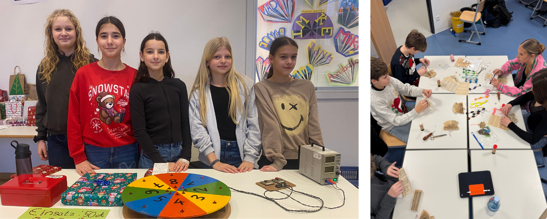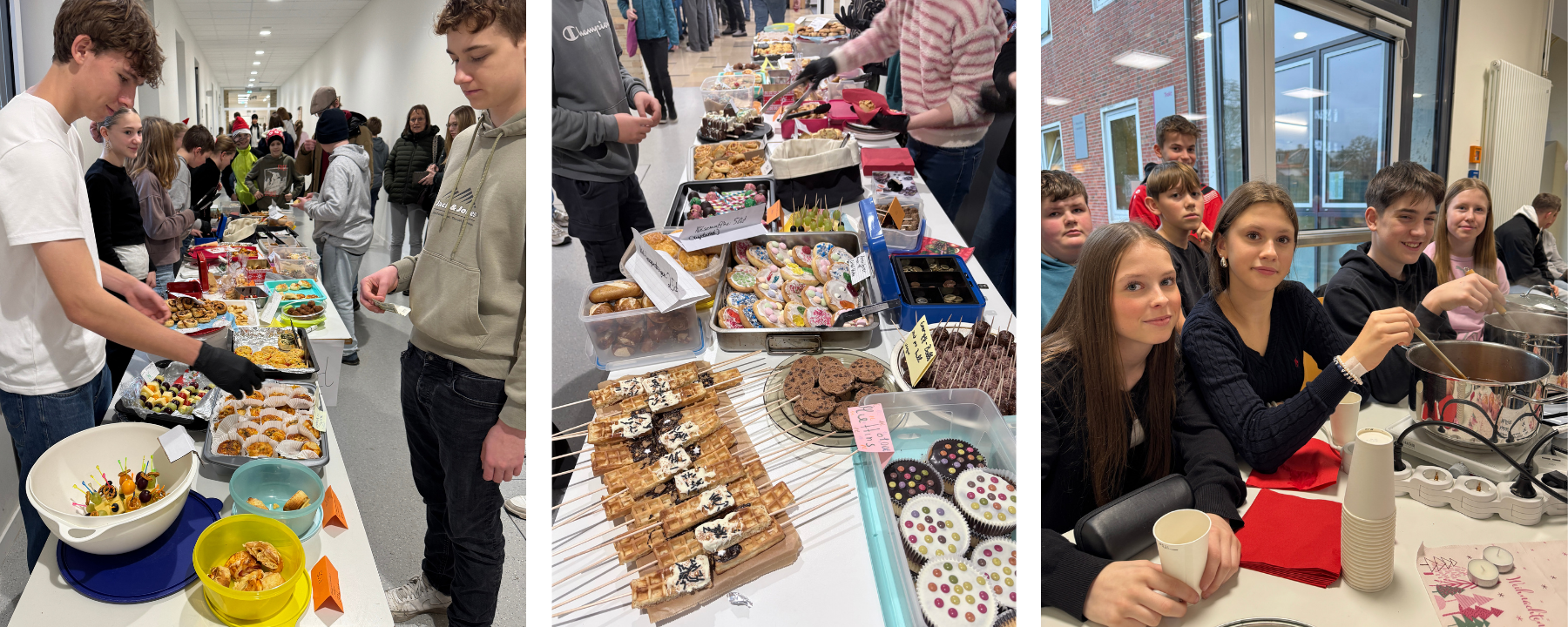 Weihnachtlich eingestimmt ging es anschließend zum großen Weihnachtsbasar, der in diesem Jahr erstmals stattfand. Alle Klassen hatten im Vorfeld eine eigene Aktion für die Schulgemeinschaft vorbereitet. In einigen Klassen konnte man Punsch genießen oder süße Leckereien probieren, in anderen luden Mitmachangebote wie Torwandschießen, Minigolf oder Bobbycar-Rennen zum Aktivwerden ein. Wer es kreativer mochte, konnte aus zahlreichen Bastelangeboten wählen: Weihnachtskarten gestalten, Sterne basteln oder Lebkuchen verzieren. Im Forum wurden außerdem verschiedenen Vorführungen, unter anderem von der Plattdeutsch-AG, dargeboten.